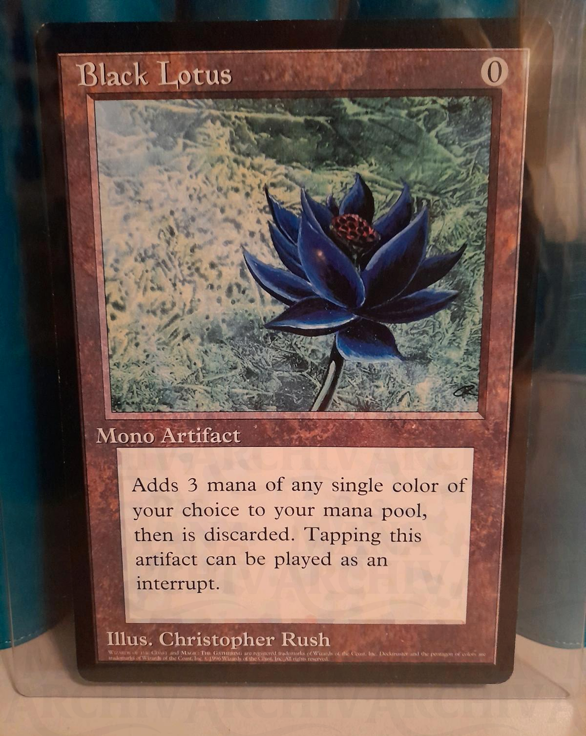 Im Juli 1996 erschien im US-Magazin SCRYE #15 diese legendäre Promo: eine riesige Black Lotus Karte im Oversize-Format, exklusiv als Beilage – offiziell lizenziert von Wizards of the Coast und illustriert von Christopher Rush. Die Karte selbst ist ikonisch, das Motiv weltberühmt und der Release ein echter Meilenstein in der Sammelkultur.